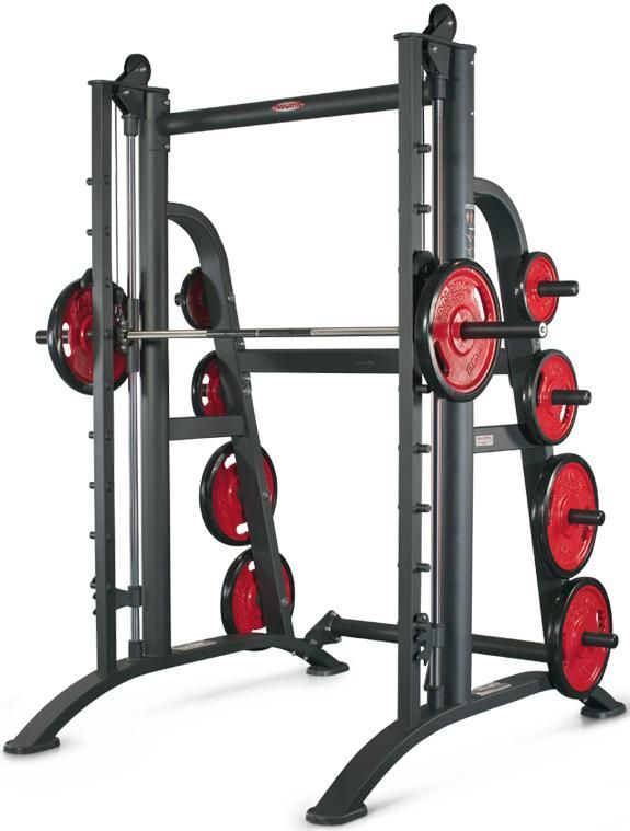 Смит-машина – многофункциональный тренажер, который с успехом заменяет одновременно необходимые в любом зале стойки для приседаний и специализированные скамейки для жимов лежа, а также позволяет выполнить ряд иных специальных упражнений: приседания и выпады со штангой на плечах, тяги штанги в наклоне. Ряд этих упражнений требует наличия регулируемой скамейки, которая не входит в базовое исполнение HP 120. Тренажер в определенном смысле заменяет собой штангу, однако ход грифа по направляющим позволяет не контролировать его равновесие и сконцентрироваться на выполнении упражнения. Облегчение техники выполнения упражнения позволяет новичкам выполнять упражнения, которые в варианте со свободной штангой достаточно сложны. Опытные пользователи могут выполнять упражнения со таким смещением акцентов, которое не допускает использование свободной штанги. Универсализм смит-машины позволяет полноценно оборудовать небольшой зал, однако смит-машина (а часто две!) требуется в любом большом зале, даже если в нем есть прочее оборудование, специализированное для выполнения отдельных упражнений. Особенностью данного тренажера является наличие противовеса – грузов, уравновешивающих вес грифа и его каретки, поэтому нагрузка при выполнении упражнений может быть сколь угодно малой, что позволяет комфортно работать на тренажере новичкам и женщинам, для которых даже вес грифа может оказаться слишком большим. При необходимости противовес может быть отцеплен. Поскольку данный тренажер рассчитан на опытных культуристов, наличие противовеса придает тренажеру дополнительный универсализм, то есть позволяет тренироваться и неопытным пользователям.
