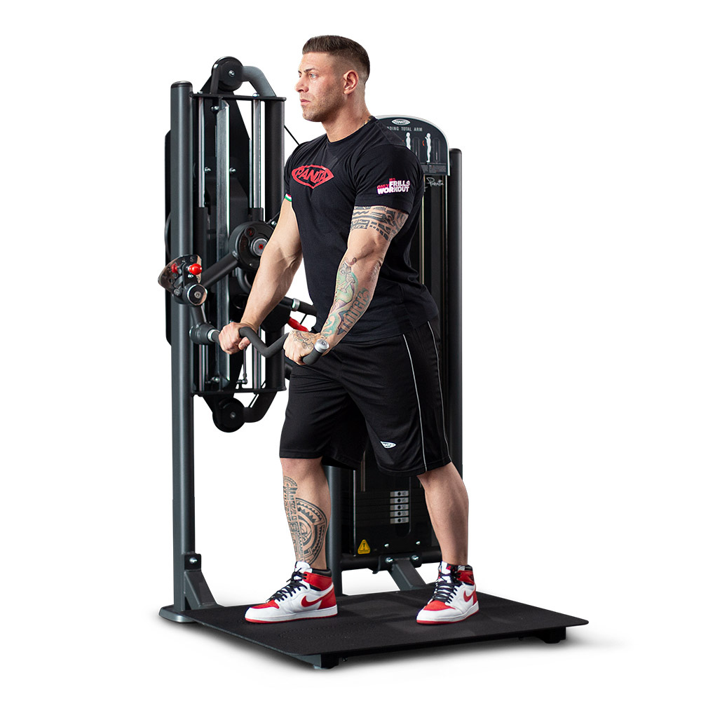 Panatta 1FE055 — это тренажер двойного назначения для комплексной тренировки рук, эффективно воспроизводящий сгибание рук для бицепсов и разгибание для трицепсов в положении стоя.