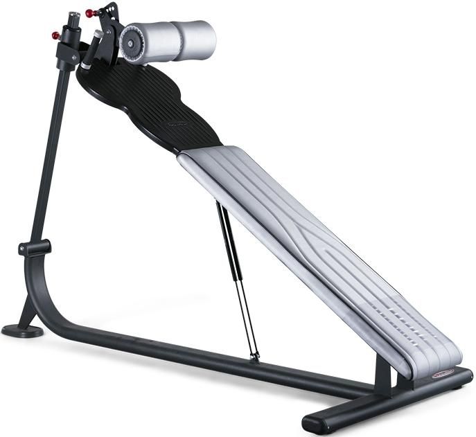 Угол наклона скамьи устанавливается одним движением с помощью удобного механизма. За счет этого происходит изменение уровня нагрузки во время занятий при выполнении скручиваний. Удобный валик-фиксатор для ног надежно позволяет занять исходное положение спортсмену и поддерживать его в течение всего подхода даже при самом большом угле наклона скамьи! Рукояти рядом с фиксирующим валиком помогают покинуть тренажер в конце тренировки.