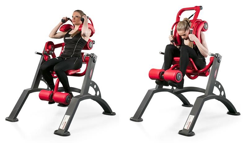 Наличие специальных валиков массируют мышцы низа и верха спины, полностью снимая с них нежелательную нагрузку во время выполнения наклонов, присутствующих на других тренажерах. Фиксатор для ног позволяет совершать упражнение с предельно четкой техникой, исключая вовлечение других мышц в работу, кроме мышц пресса. Упоры для плеч под рукоятями не создают дискомфорта во время занятий.