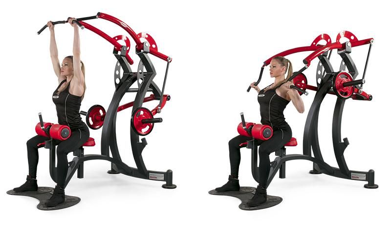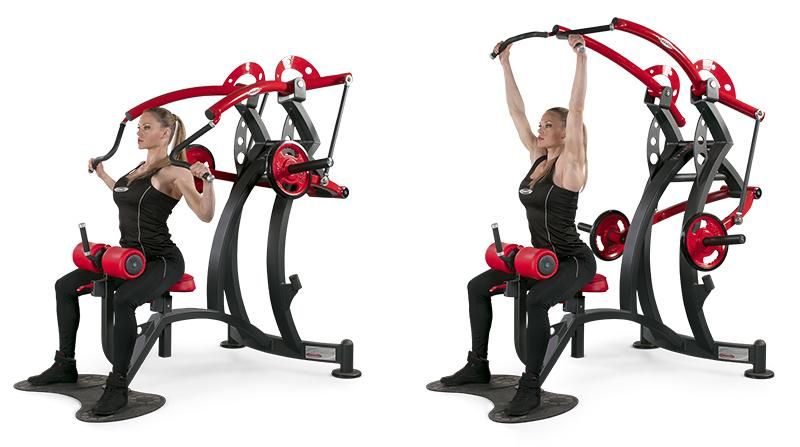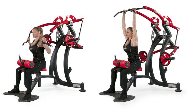 Тренажер для развития мышц верхней части спины – в первую очередь широчайшей мышцы спины. Выполняемое упражнение – тяги сверху сидя. Этот тренажер относится к группе основных тренажеров, позволяя тренировать мышцы спины в классическом упражнении, по воздействию сходном с подтягиваниями на перекладине. Данный тренажер в отличие от классического грузоблочного тренажера, в котором осуществляется тяга вниз широкой ручки (см. модели XP 1 и FE 1), позволяет не пригибать голову вперед в «нижней» фазе упражнения, то есть не смещать вынужденно нагрузку на трапецию.