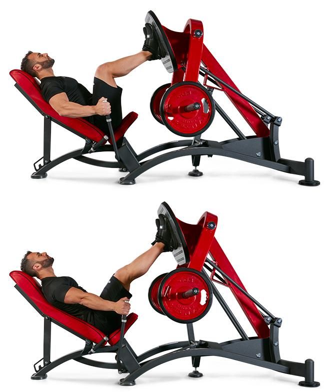 Тренажер для всестороннего развития бедра – прежде всего квадрицепса (передней поверхности), а также задней поверхности (бицепс), внутренней поверхности и ягодиц. Выполняемое упражнение – жим ногами в положении лежа под углом. В плане воздействия на мышцы тренажер аналогичен приседаниям со штангой, однако, в отличие от последних, не создает нагрузку на позвоночный столб, поэтому может использоваться для тренировки ног людьми с травмой позвоночника. Безусловным плюсом тренажера является то, что он не требует от занимающегося такой сложной техники, как приседания со штангой. Это, в свою очередь, усиливает изоляцию мышц бедра, так как «автоматически» обеспечивает стабильное положение тела и исключает работу мышц торса, обеспечивающих поддержание устойчивости при работе со свободным весом. Кроме того, тренажер исключает работу мышц плечевого пояса и рук, которые удерживают штангу в равновесии на плечах. Все это обеспечивает повышенную безопасность упражнения для суставов и позвоночного столба. В отличие от тренажера HP 586, в котором жим ногами реализован с площадкой, совершающей прямолинейное движение по направляющим, рычажный жим ногами дает криволинейную траекторию движения точки упора ног, что является более естественным в анатомическом плане.